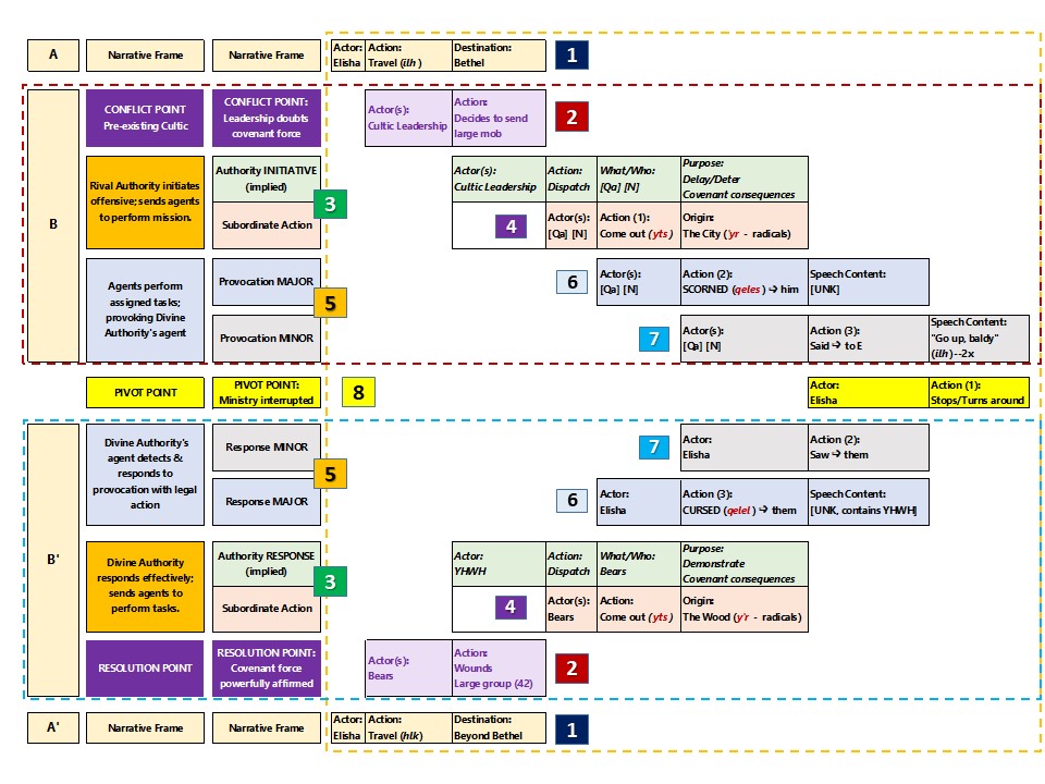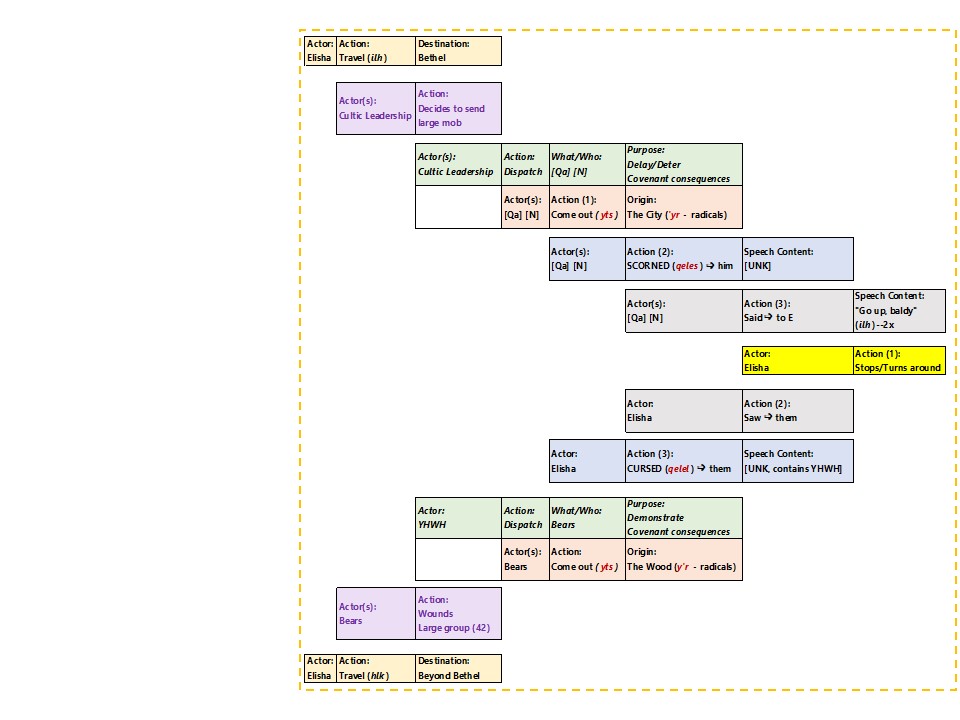 This would allow the mob to come out of the city AFTER Elisha had traversed and emerged from the city, and was on the third segment of the trip (Bethel to Carmel. This makes much better sense of the looking behind, but would require: (1) the go up taunt to refer to something OTHER THAN the incline that Elisha would still have ahead of him, if he were still on the first segment; and (2) require the change of locomotion word from ilh (segment 1) to hlk (segment 2) to be of no consequence. [Biblical writers rarely do that! they layer nuance upon nuance, in the most intriguing and powerful ways.]