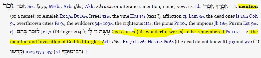 “The name is to be a “memorial” (zēker; GK 2352); that is, it was to be for the act of uttering the mighty deeds of God throughout all generations. (There are twenty-eight instances of this concept in the OT; see Cassuto, 39.) Strictly speaking the noun used here (though the NIV translates it as a verb to fit an English idiom—“to be remembered”) is not a simple “recollection” or “remembrance.” Brevard S. Childs (Memory and Tradition in Israel [London: SCM, 1962], 70–73) demonstrates that the parallelism of Psalm 6:5 (“No one remembers you [zikrekā] when he is dead. Who praises you from the grave?”) shows that the problem with the dead is not their inability to remember Yahweh but their inability to share in the praise of Yahweh (cf. Ps 135:13; Hos 12:5). So here in v. 15 the joy of Israel’s worship will be to share in the praise of the essence, power, and significance of “I am he who is, was, and will be [present]” when I say I will be there. [EBC2]