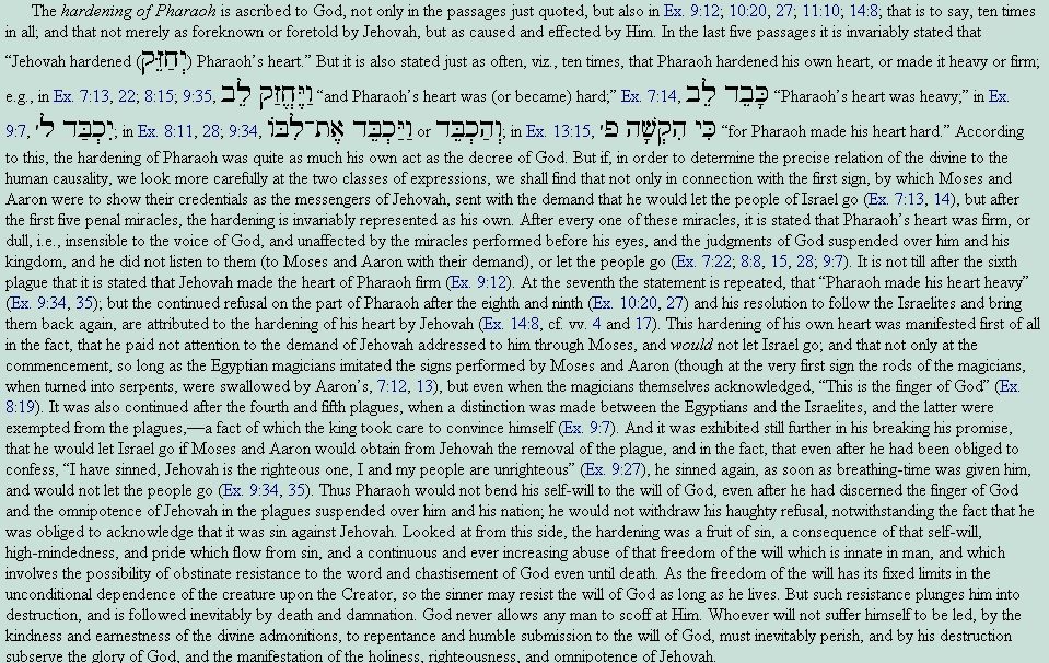 “The hardening of Pharaoh is ascribed to God, not only in the passages just quoted, but also in Ex. 9:12; 10:20, 27; 11:10; 14:8; that is to say, ten times in all; and that not merely as foreknown or foretold by Jehovah, but as caused and effected by Him. In the last five passages it is invariably stated that “Jehovah hardened (...) Pharaoh’s heart.” But it is also stated just as often, viz., ten times, that Pharaoh hardened his own heart, or made it heavy or firm; e.g., in Ex. 7:13, 22; 8:15; 9:35, ... “and Pharaoh’s heart was (or became) hard;” Ex. 7:14, ... “Pharaoh’s heart was heavy;” in Ex. 9:7, ...; in Ex. 8:11, 28; 9:34, ... or ...; in Ex. 13:15, ... “for Pharaoh made his heart hard.” According to this, the hardening of Pharaoh was quite as much his own act as the decree of God. But if, in order to determine the precise relation of the divine to the human causality, we look more carefully at the two classes of expressions, we shall find that not only in connection with the first sign, by which Moses and Aaron were to show their credentials as the messengers of Jehovah, sent with the demand that he would let the people of Israel go (Ex. 7:13, 14), but after the first five penal miracles, the hardening is invariably represented as his own. After every one of these miracles, it is stated that Pharaoh’s heart was firm, or dull, i.e., insensible to the voice of God, and unaffected by the miracles performed before his eyes, and the judgments of God suspended over him and his kingdom, and he did not listen to them (to Moses and Aaron with their demand), or let the people go (Ex. 7:22; 8:8, 15, 28; 9:7). It is not till after the sixth plague that it is stated that Jehovah made the heart of Pharaoh firm (Ex. 9:12). At the seventh the statement is repeated, that “Pharaoh made his heart heavy” (Ex. 9:34, 35); but the continued refusal on the part of Pharaoh after the eighth and ninth (Ex. 10:20, 27) and his resolution to follow the Israelites and bring them back again, are attributed to the hardening of his heart by Jehovah (Ex. 14:8, cf. vv. 4 and 17). This hardening of his own heart was manifested first of all in the fact, that he paid no attention to the demand of Jehovah addressed to him through Moses, and would not let Israel go; and that not only at the commencement, so long as the Egyptian magicians imitated the signs performed by Moses and Aaron (though at the very first sign the rods of the magicians, when turned into serpents, were swallowed by Aaron’s, 7:12, 13), but even when the magicians themselves acknowledged, “This is the finger of God” (Ex. 8:19). It was also continued after the fourth and fifth plagues, when a distinction was made between the Egyptians and the Israelites, and the latter were exempted from the plagues,—a fact of which the king took care to convince himself (Ex. 9:7). And it was exhibited still further in his breaking his promise, that he would let Israel go if Moses and Aaron would obtain from Jehovah the removal of the plague, and in the fact, that even after he had been obliged to confess, “I have sinned, Jehovah is the righteous one, I and my people are unrighteous” (Ex. 9:27), he sinned again, as soon as breathing-time was given him, and would not let the people go (Ex. 9:34, 35). Thus Pharaoh would not bend his self-will to the will of God, even after he had discerned the finger of God and the omnipotence of Jehovah in the plagues suspended over him and his nation; he would not withdraw his haughty refusal, notwithstanding the fact that he was obliged to acknowledge that it was sin against Jehovah. Looked at from this side, the hardening was a fruit of sin, a consequence of that self-will, high-mindedness, and pride which flow from sin, and a continuous and ever increasing abuse of that freedom of the will which is innate in man, and which involves the possibility of obstinate resistance to the word and chastisement of God even until death. As the freedom of the will has its fixed limits in the unconditional dependence of the creature upon the Creator, so the sinner may resist the will of God as long as he lives. But such resistance plunges him into destruction, and is followed inevitably by death and damnation. God never allows any man to scoff at Him. Whoever will not suffer himself to be led, by the kindness and earnestness of the divine admonitions, to repentance and humble submission to the will of God, must inevitably perish, and by his destruction subserve the glory of God, and the manifestation of the holiness, righteousness, and omnipotence of Jehovah.” [Keil, C. F., & Delitzsch, F. (1996). Commentary on the Old Testament (Vol. 1, pp. 294–295). Peabody, MA: Hendrickson.]
